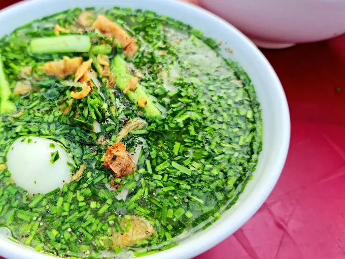 Món chính là bánh canh hẹ, với nước dùng thanh ngọt, sợi bánh mềm, ăn kèm với chả cá, trứng cút.