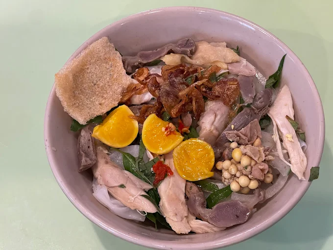 Bánh ướt mềm mịn, ăn kèm lòng gà, thịt gà xé, trứng non, rau răm và hành phi