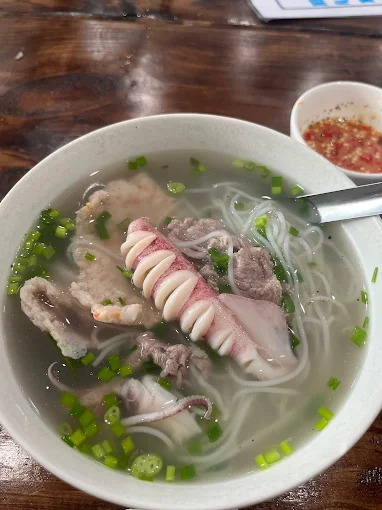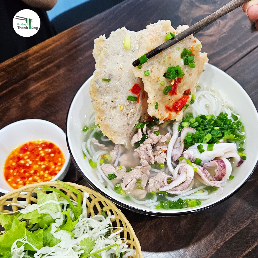 Bún quậy hải sản – gồm tôm, mực, chả cá tươi.