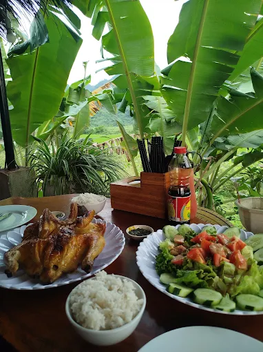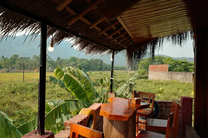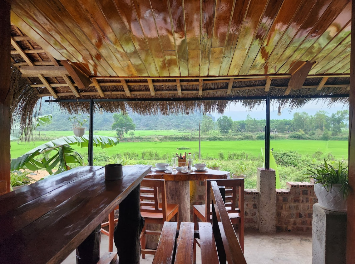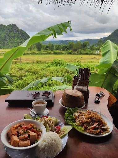 Không gian: Nhà hàng có khu vườn rộng, view đồng lúa và núi đá, tạo cảm giác thư giãn.