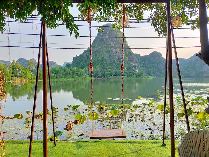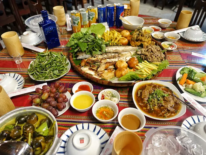 Thực đơn phong phú, nổi bật với đặc sản dê núi Ninh Bình và các món ăn đồng quê như gà nướng mật ong, cá quả nướng riềng mẻ, ốc nhồi hấp lá bưởi, ba ba om chuối đậu.