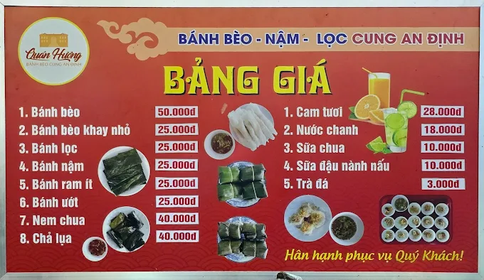 Quán Hương Bèo Nậm Lọc Cung An Định là một địa điểm ẩm thực nổi tiếng tại Huế, chuyên phục vụ các món bánh truyền thống như bánh bèo, bánh nậm, bánh lọc, bánh ram ít và bánh ướt.