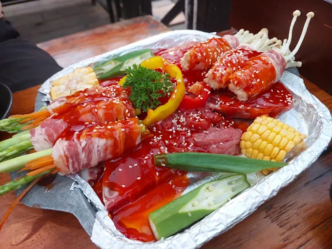 Thực đơn phong phú: Các món nướng hấp dẫn từ bò, heo, gà, hải sản, đặc biệt là bò sốt trứng muối/phô mai – món best seller của quán.