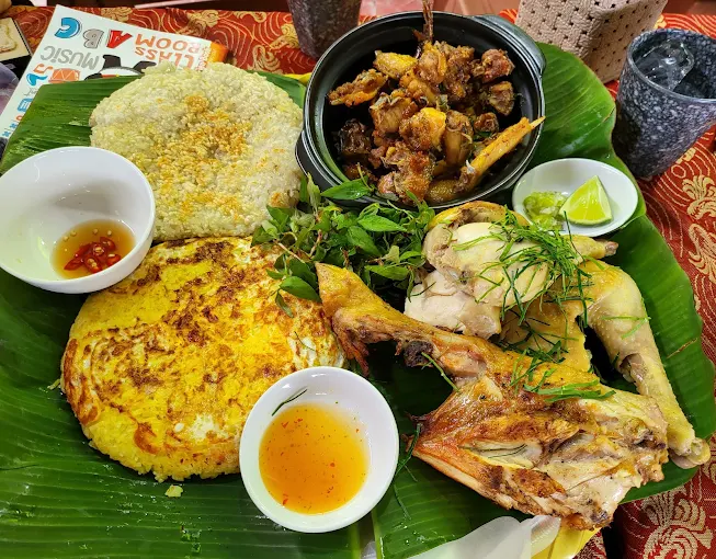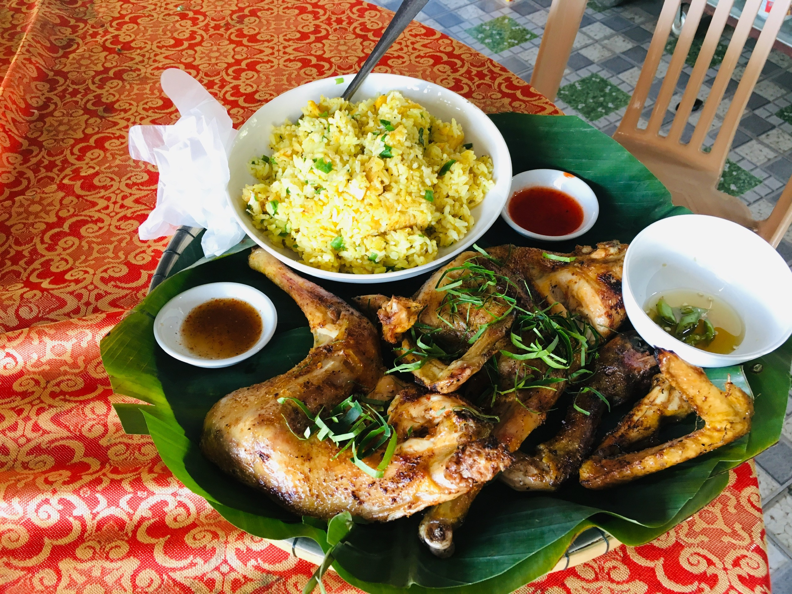 Món ăn nổi bật: Gà nướng lá chanh thơm lừng, cơm chiên nóng hổi, hương vị đậm đà.