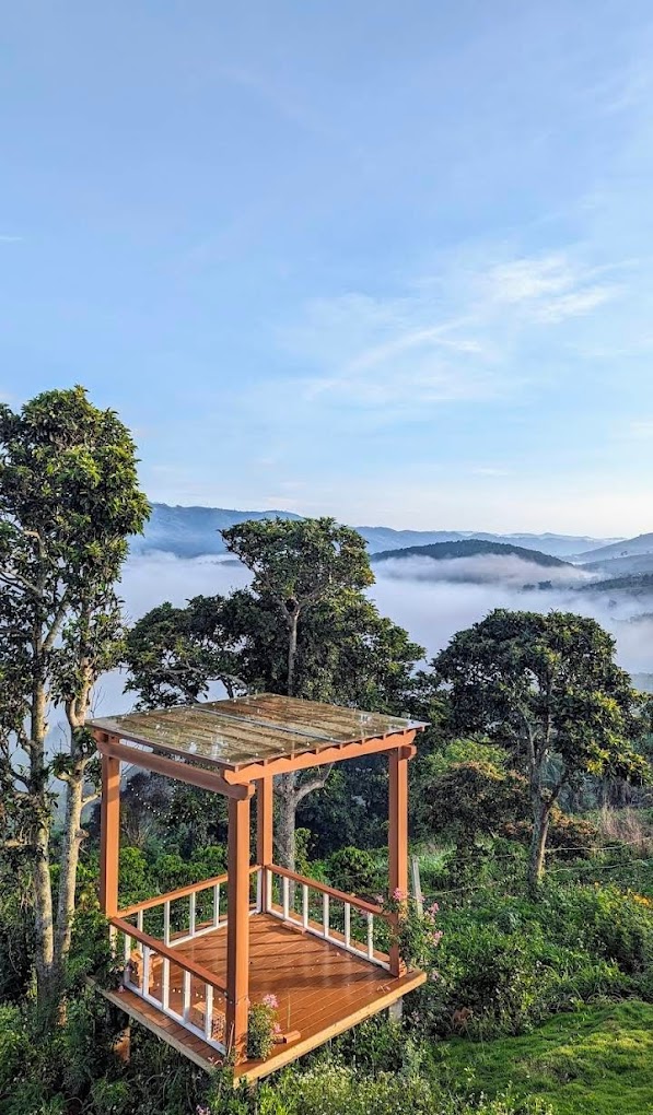 Nhìn ra khung cửa lều, toàn cảnh đồi trà cà phê trải dài như một bức tranh tĩnh lặng panorama. Đây không chỉ là một view, mà là một trạng thái tâm hồn, nơi trí tưởng tượng bay bổng và lòng nhẹ nhàng như làn mây trôi dọc theo đỉnh đồi.