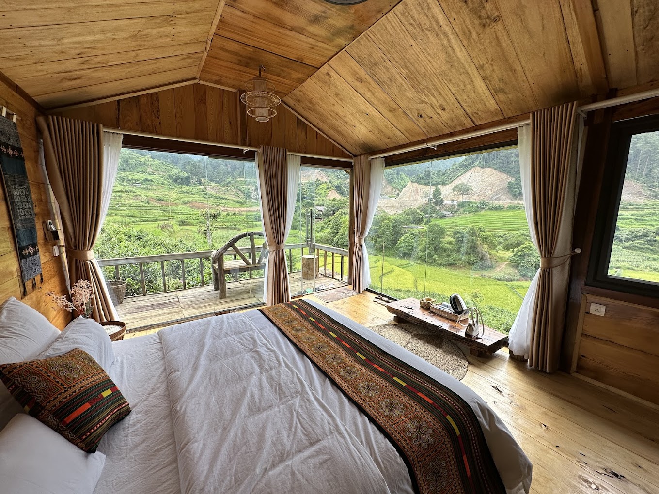 Homestay được xây dựng theo phong cách truyền thống kết hợp hiện đại, sử dụng chất liệu gỗ Pơ Mu, tạo nên không gian ấm cúng và gần gũi với thiên nhiên. Các phòng nghỉ có tường kính lớn, tận dụng ánh sáng tự nhiên và mang đến tầm nhìn toàn cảnh ra đồi núi và cánh đồng xung quanh.