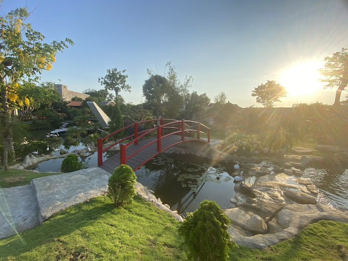 Không gian xanh mát: Bao quanh bởi cây cối tươi tốt, thảm cỏ xanh mướt và hồ nước trong lành, tạo nên một khung cảnh tự nhiên vừa mộc mạc, bình dị mà không kém phần bắt mắt.
