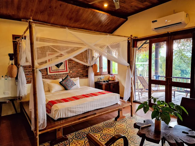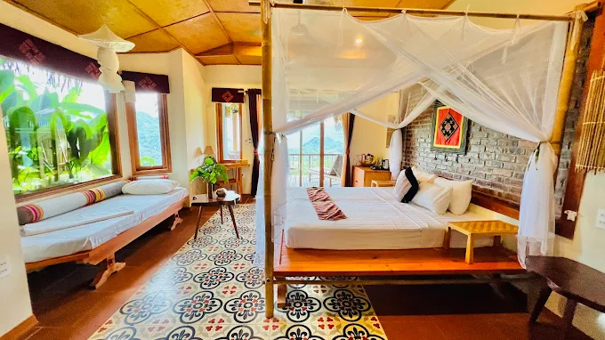 Không gian: Các phòng nghỉ được thiết kế theo phong cách sinh thái, có view toàn cảnh ruộng bậc thang và núi rừng.