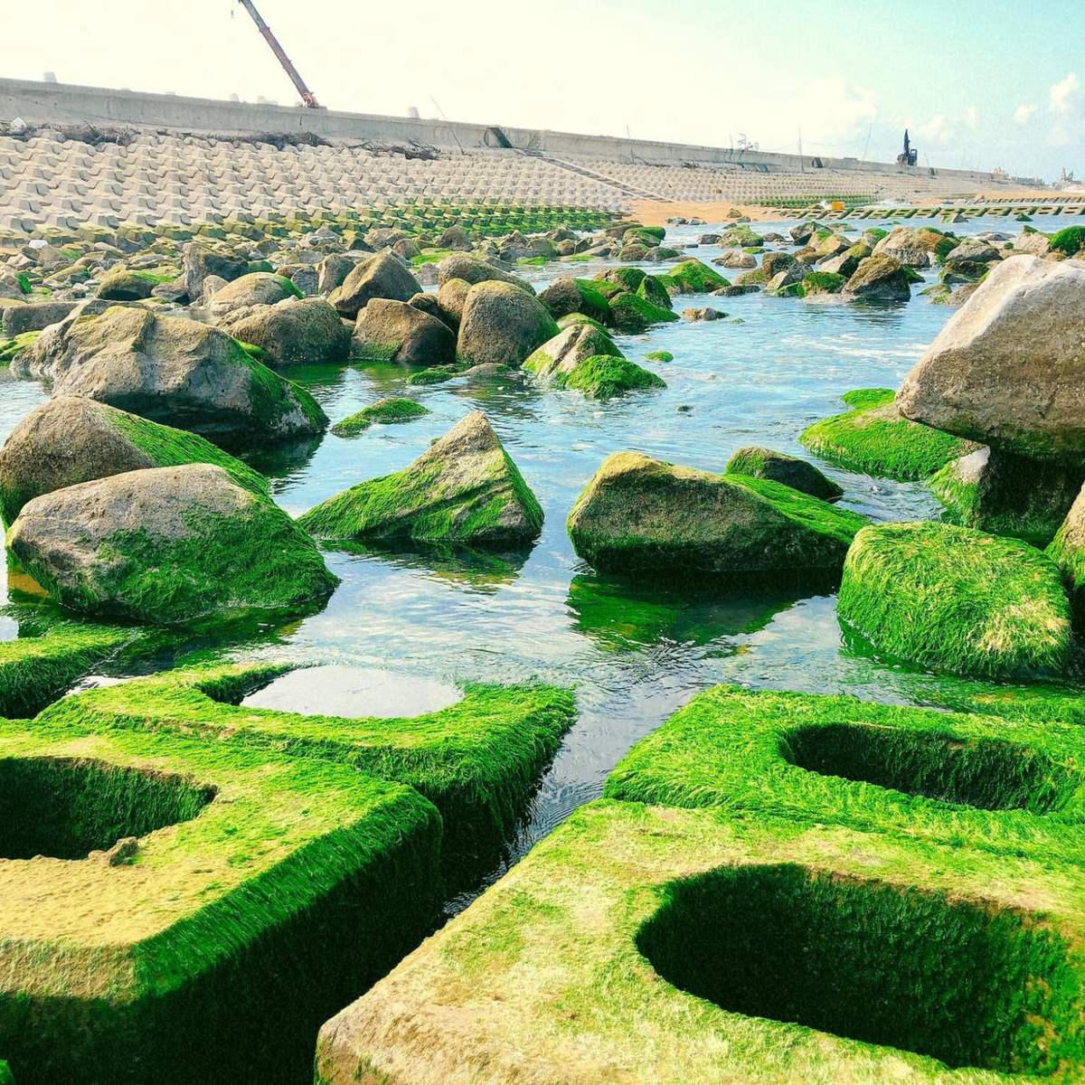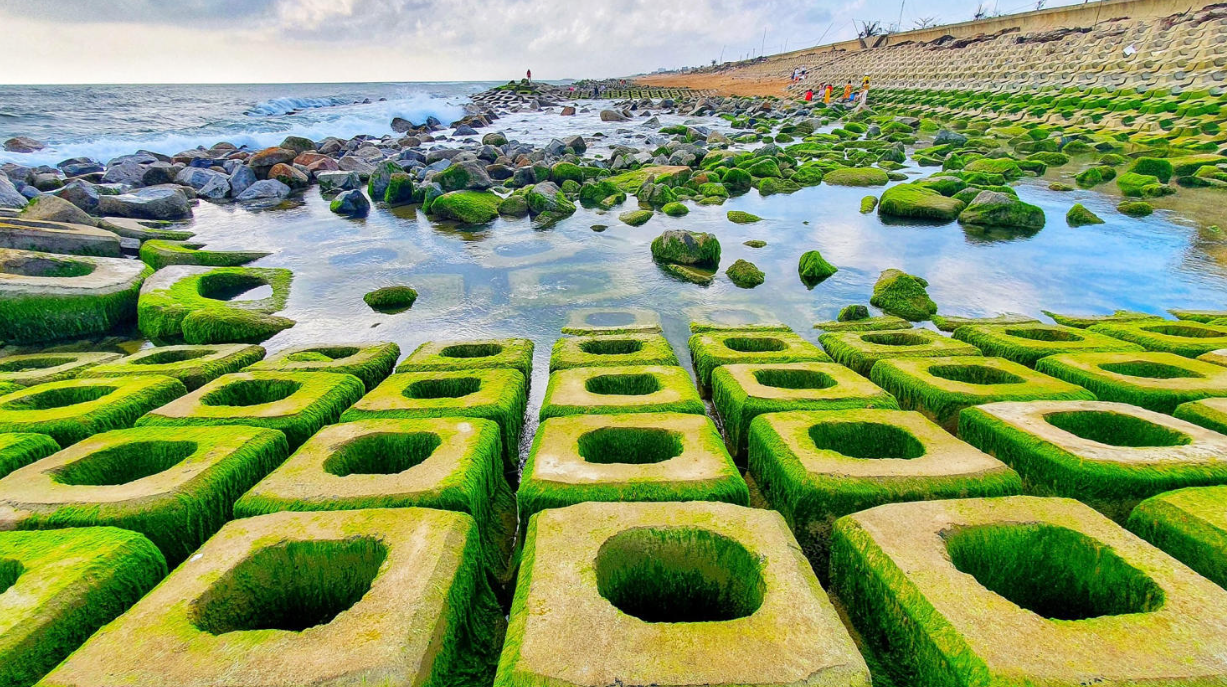 Các khối bê tông với đủ kích thước được rêu xanh bám chặt nổi lênh đênh. Mỗi khi thủy triều rút thì Rêu Xanh Xóm Rớ như tràn ngập trong sắc xanh, tô điểm thêm cho khung cảnh thiên nhiên là ánh mặt trời chiếu rọi.