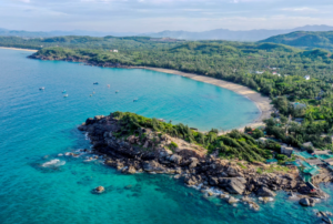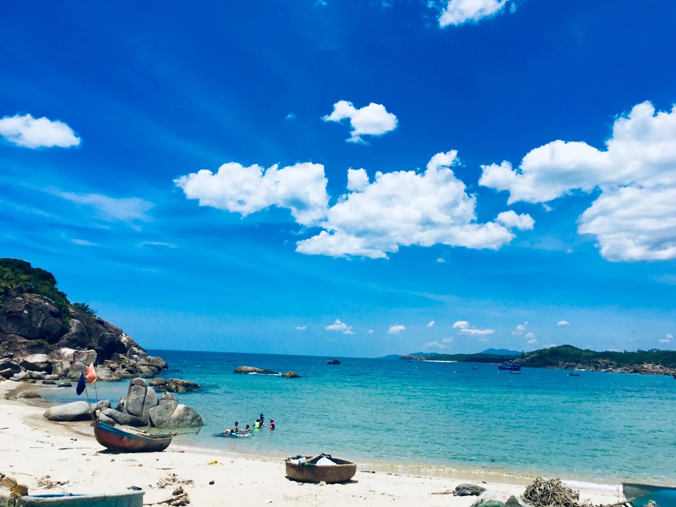 - Điểm nổi bật chính là thảm cát vàng mịn, cong cong tựa hình vầng trăng khuyết hòa vào làn nước biển xanh trong, bao bọc bởi những rặng dương xỉ nối với những dãy núi hùng vĩ chắn xung quanh.