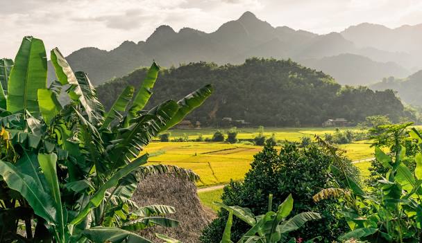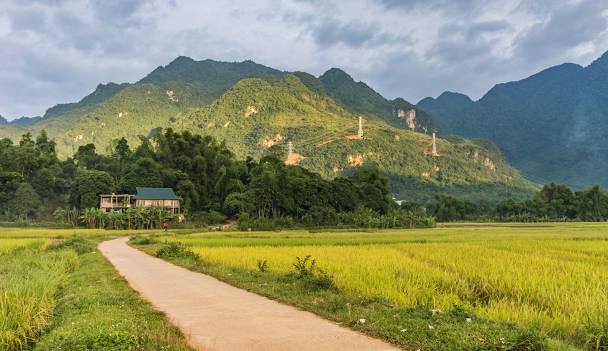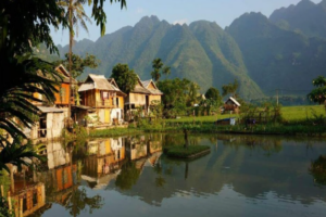 Khung cảnh thiên nhiên tuyệt đẹp: Bản Lác nằm trong thung lũng Mai Châu, được bao quanh bởi những dãy núi xanh mướt và cánh đồng lúa bát ngát.