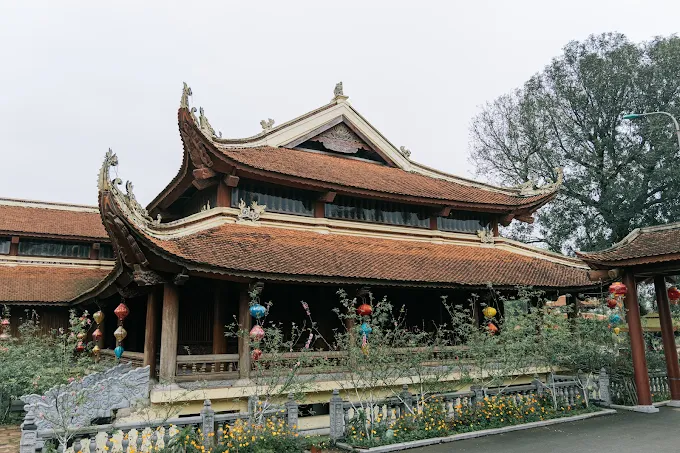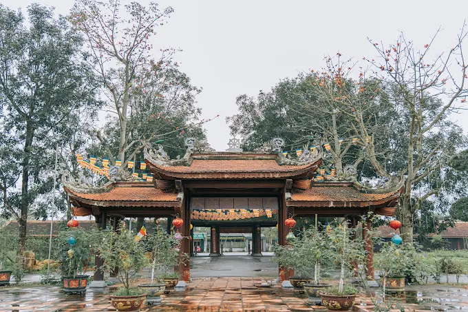 Không gian nơi đây thoáng đãng, phong cảnh hữu tình, đặc biệt nổi bật với cổng Tam quan được làm hoàn toàn từ gỗ lim và sến, chạm trổ tinh xảo, thể hiện rõ nét kiến trúc truyền thống Việt Nam.