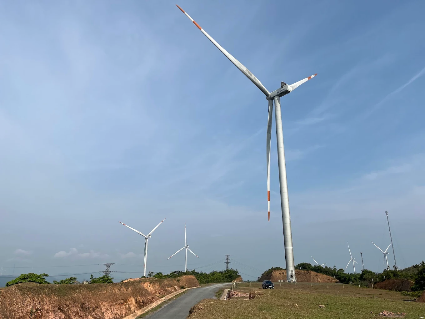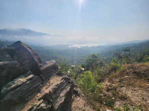 Từ đỉnh núi, du khách có thể phóng tầm mắt ngắm lòng hồ thủy điện Rào Quán, cánh đồng điện gió Hướng Linh, và những dãy núi trùng điệp xa tít tắp.