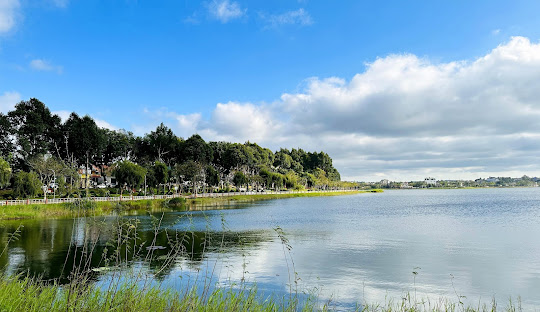 Bao quanh hồ là những đồi cà phê xanh mướt, hàng cây lao xao và các con đường uốn lượn tạo nên vẻ đẹp lãng mạn.