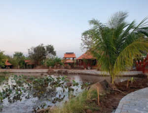 Những căn nhà lạ mắt giữa bãi cỏ xanh và cây cỏ tạo nên một bức tranh hòa quyện, tận hưởng sự yên bình, vừa có suối vừa có rừng tre. Đây là một nơi tốt để thiền định, gần gũi hòa nhập vào thiên nhiên, tái tạo năng lượng.