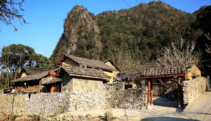 Ngôi nhà truyền thống của người Mông, với kiến trúc mộc mạc, mái ngói âm dương và hàng rào đá đặc trưng.