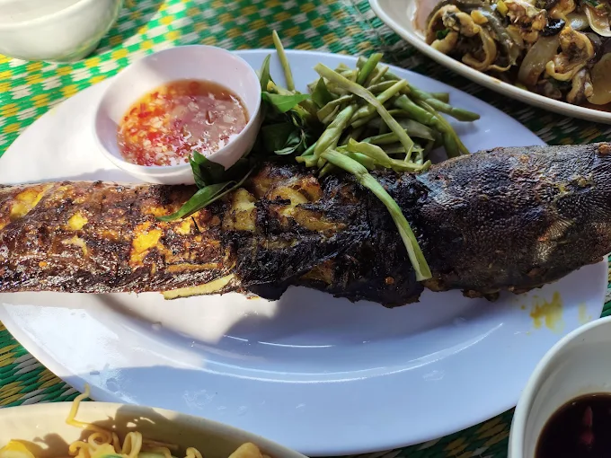 Các món ăn dân dã như cá trê nướng, ếch xào, tôm hấp, phục vụ ngay tại khu vực Suối Khe Su.