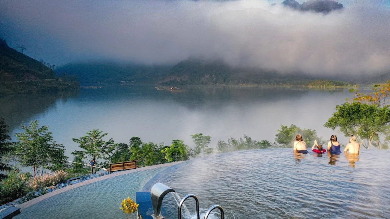 4 hồ bơi vô cực khoáng nóng: View nhìn ra hồ Suối Chiếu và núi rừng Tà Xùa