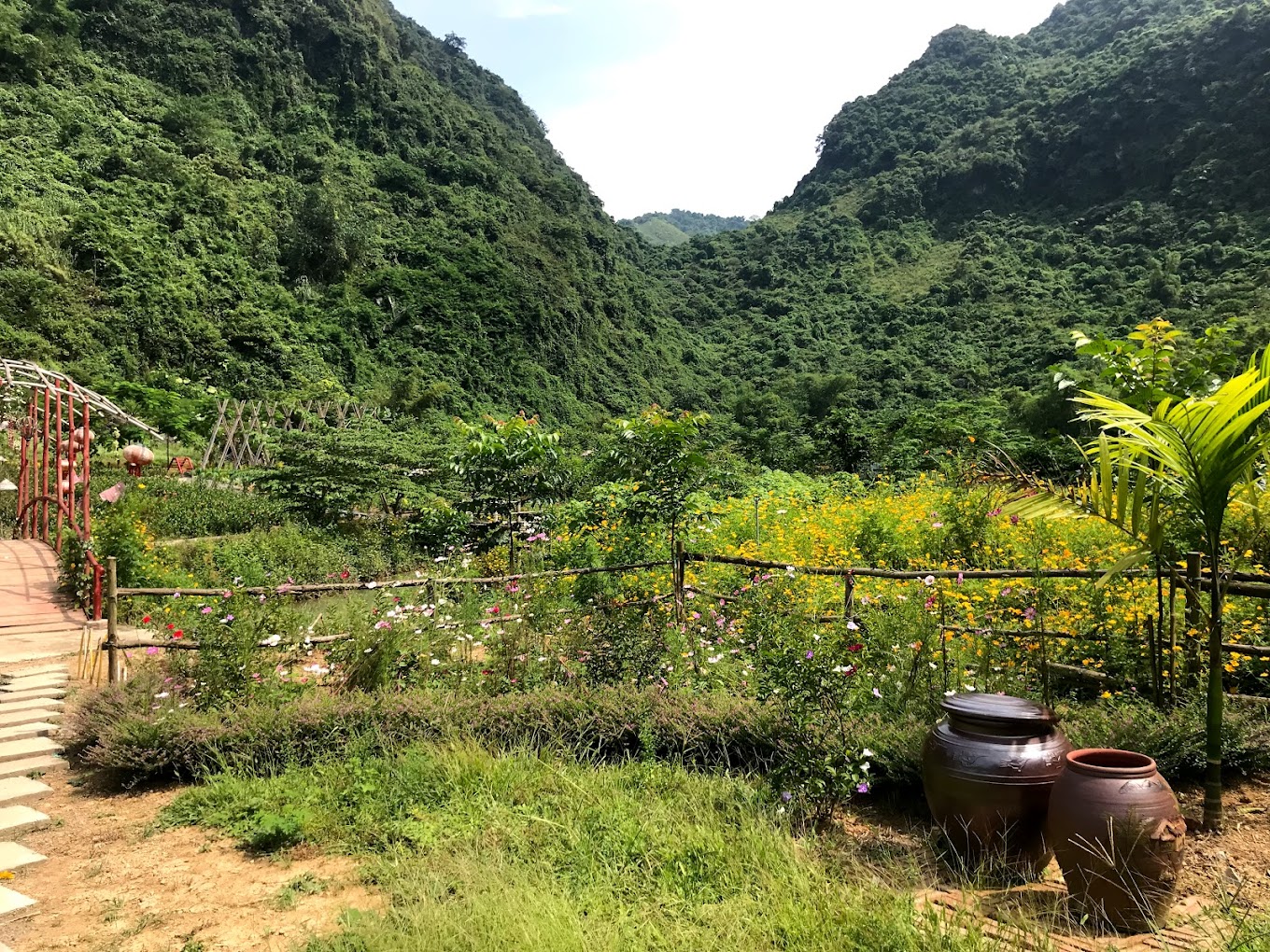 Bên cạnh những vườn hoa và những yếu tố thiên nhiên, khu du lịch này còn thiết kế thêm những nếp nhà sàn, bố trí thêm nhiều tiểu cảnh độc đáo, thêm hàng rào, ao cá, xích đu,...