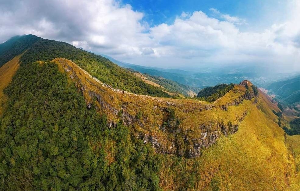 - Cung đường trekking đi qua rừng nguyên sinh, rừng trúc và các đồi cỏ lau trải dài. Đoạn đường cuối cùng lên đỉnh được ví như "sống lưng khủng long," với hai bên là vách núi hiểm trở.