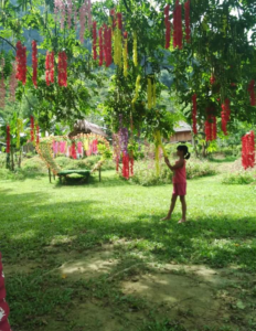 Không gian: Được thiết kế như một khu vườn cổ tích với nhiều loại hoa theo mùa, tiểu cảnh đẹp mắt, suối nước trong xanh và các góc sống ảo cực chill.