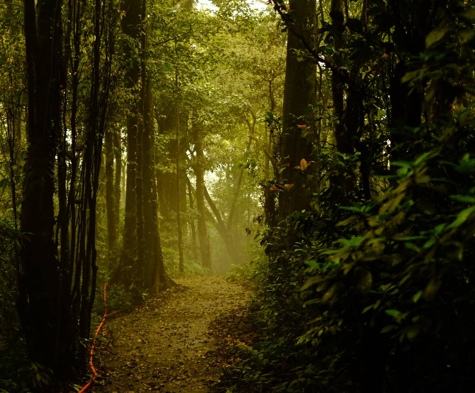 Nơi rừng xanh và sương trắng hòa vào nhau, tạo nên không gian huyền ảo. Mùa lá rụng (tháng 11 – 1), con đường rợp lá vàng là “background sống ảo” mê hoặc du khách.