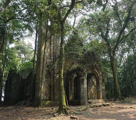 Tàn tích kiến trúc Pháp nằm giữa rừng rêu phong, mang vẻ đẹp ma mị. Buổi sáng sớm hoặc chiều muộn là thời điểm chụp ảnh đẹp nhất.