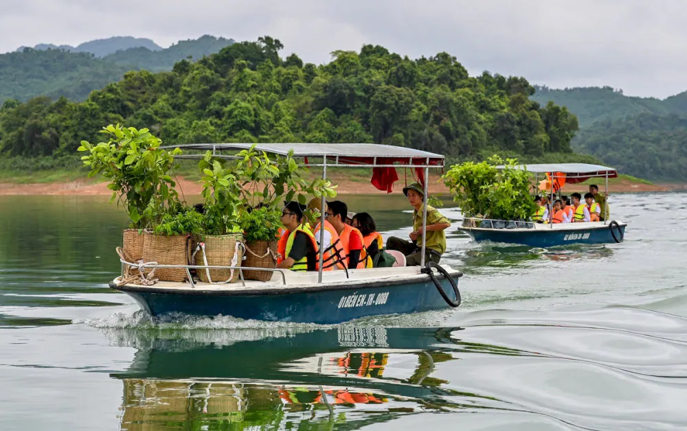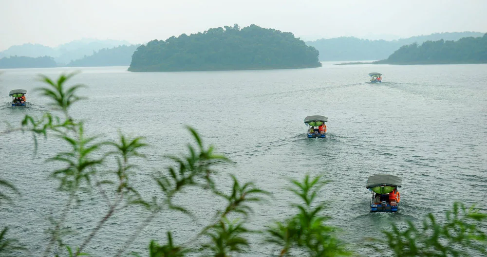 Giữa làn nước trong vắt, thuyền nhẹ trôi qua hơn 20 hòn đảo xanh rì. Khi hoàng hôn buông, mặt hồ chuyển sắc vàng hổ phách, tạo nên một khung cảnh mơ màng hiếm có.